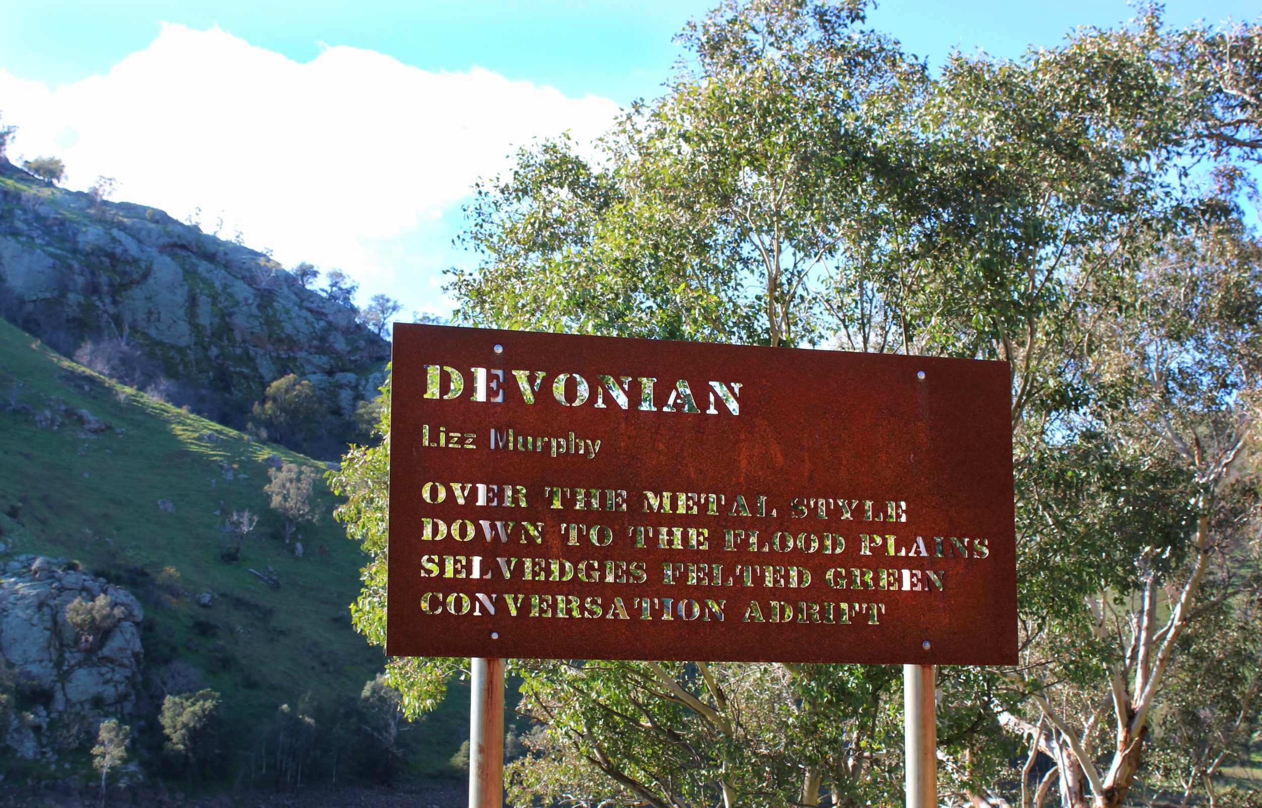 In 2014 the final of the Indelible Stencils was erected. The purpose of this project is to bring poetry to public places across the eight local government areas of the Southern Tablelands, supported by STARTS, Southern Tablelands Arts featuring local artists & poets